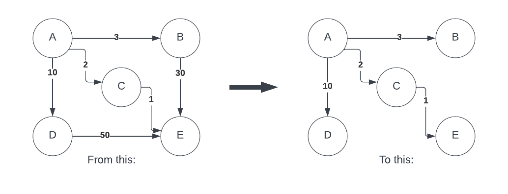 Basically the same as Spanning Tree, but now the edges have weights, but now you want to find the least-costly paths between nodes that spans the graph: