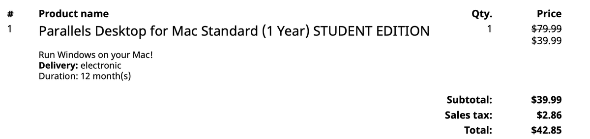 Parrallels Desktop student edition set me back $40.