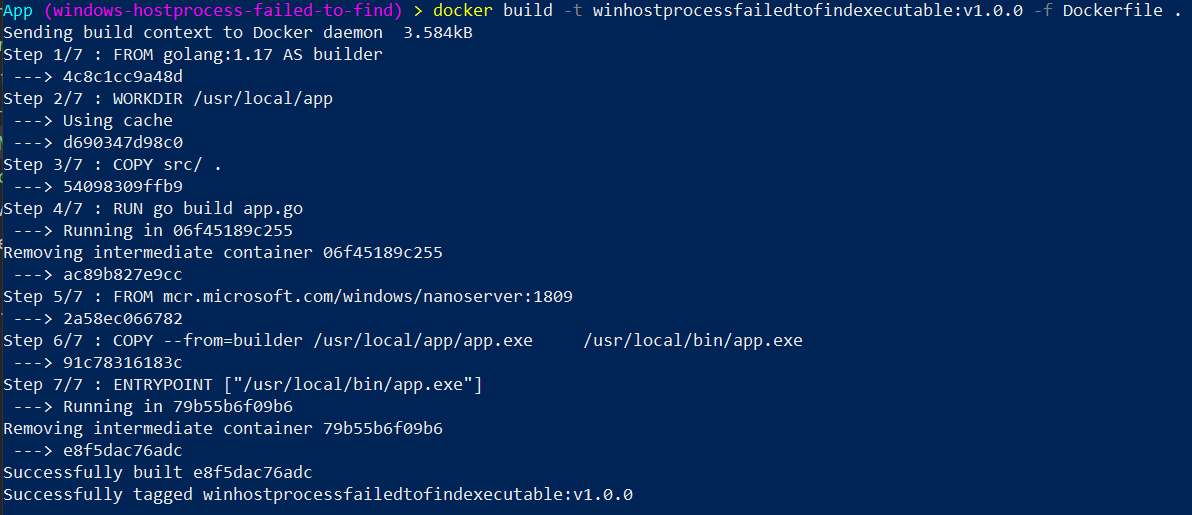 That means, if in your Dockerfile you specified the entrypoint of the app as an absolute file path like I did i.e. /usr/local/bin/app.exe, then the HostProcess pod will try to find that executable on the Windows host but it can't.
