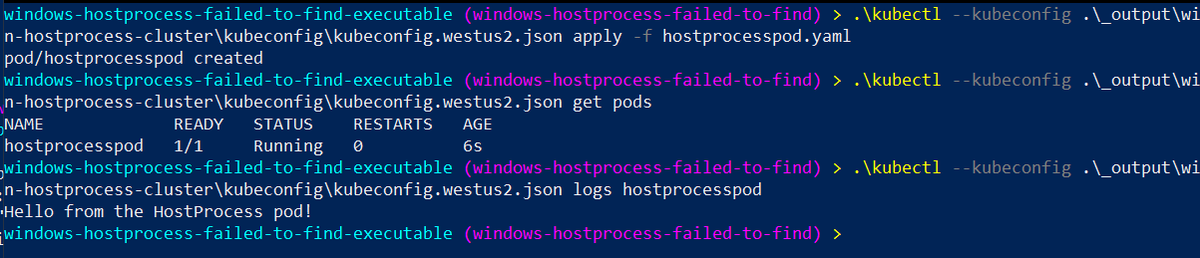 .\kubectl --kubeconfig .\_output\win-hostprocess-cluster\kubeconfig\kubeconfig.westus2.json apply -f hostprocesspod.yaml