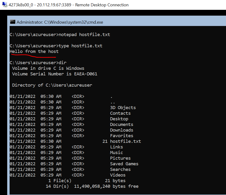 And finally you can verify by RDP'ing to the Windows agent node, that there is a new directory created by the pod: