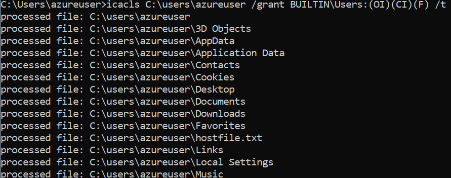 This command will give the directory C:\users\azureuser and all files/directories in it the permissions necessary for the pod to be able to read and write files.